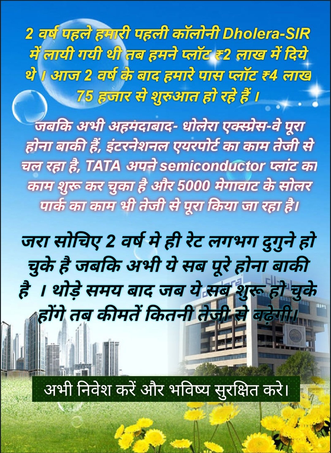 1. *निवेश के अवसर*: Dholera में प्लॉट खरीदना एक अच्छा निवेश विकल्प हो सकता है, क्योंकि यह क्षेत्र तेजी से विकसित हो रहा है।